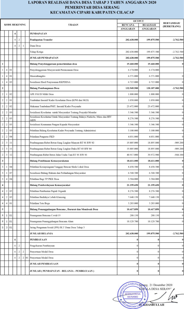 LAPORAN REALISASI DANA DESA TAHAP 3 TAHUN ANGGARAN 2020 21 Desember 2020 | Kabar Desa Berikut kami lampirkan Laporan Realisasi Dana Desa Tahap 3 Tahun Anggaran 2020 Desa Serang Kecamatan Cipari Kabupaten Cilacap. Bagikan Berita Kirim Komentar Batalkan balasanAlamat email Anda tidak akan dipublikasikan. Ruas yang wajib ditandai *Komentar * Nama * Email * Situs Web Simpan nama, email, dan situs web saya pada peramban ini untuk komentar saya berikutnya. Δ